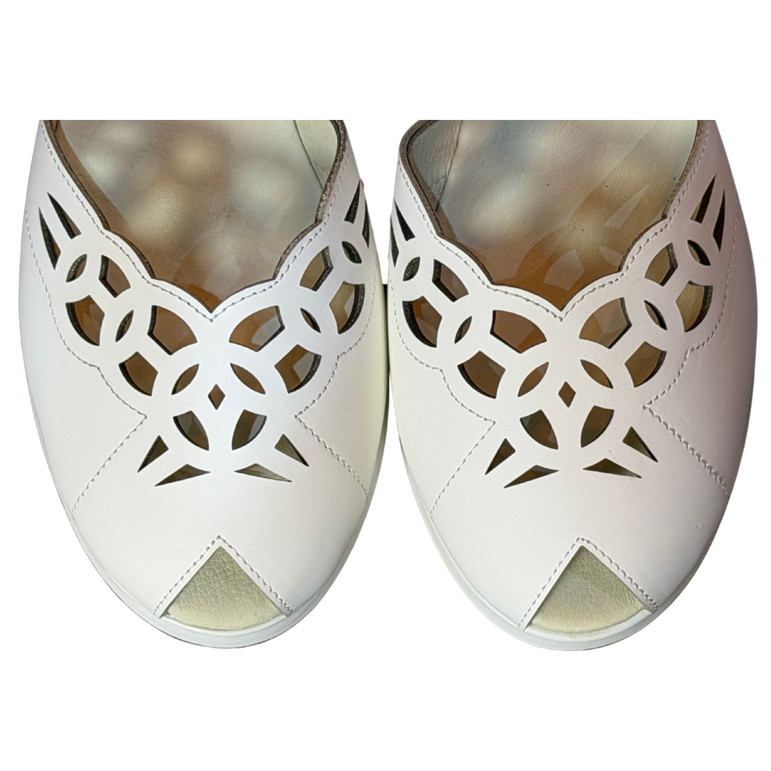 These are beautiful sandal-style shoes made from good quality white leather. They have soft leather uppers, and are also fully leather lined with a padded leather insole for extra comfort. The outsole is made of poly-composite rubber. This style is a regular width fitting.